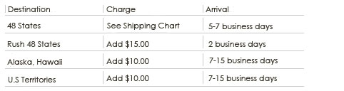 anywhere in the contiguous 48 states. Please allow up to fifteen (15) business days for shipments to Alaska, Hawaii, US Territories, and A.P.O. and F.P.O. addresses. Some items sent directly from our suppliers may  not arrive in the same box or within the same time, but will arrive in the estimated delivery times normally expected.